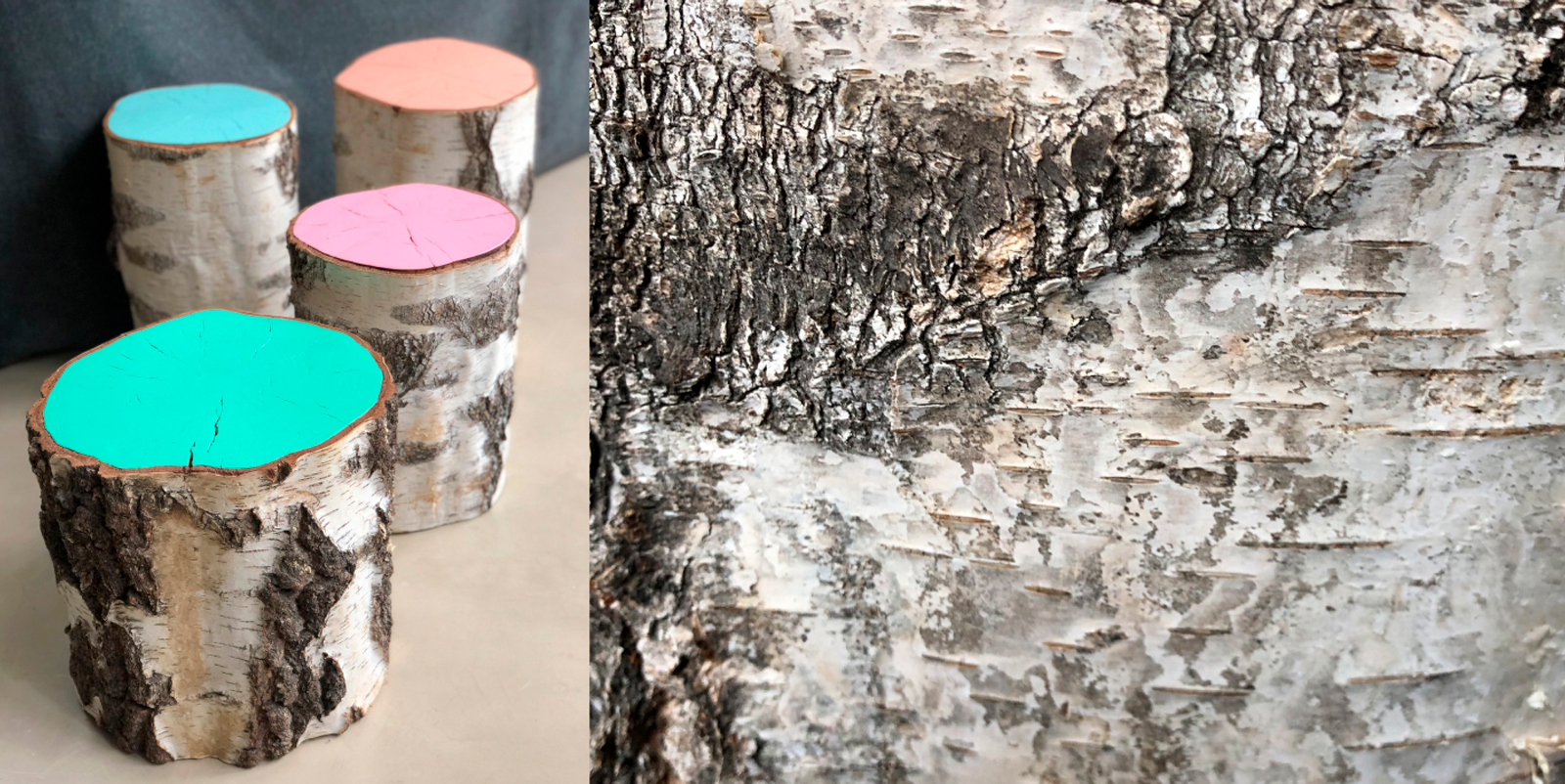 Quatre âmes de bouleaux se tiennent debout, habitées. Leurs surfaces colorées ne masquent rien — elles