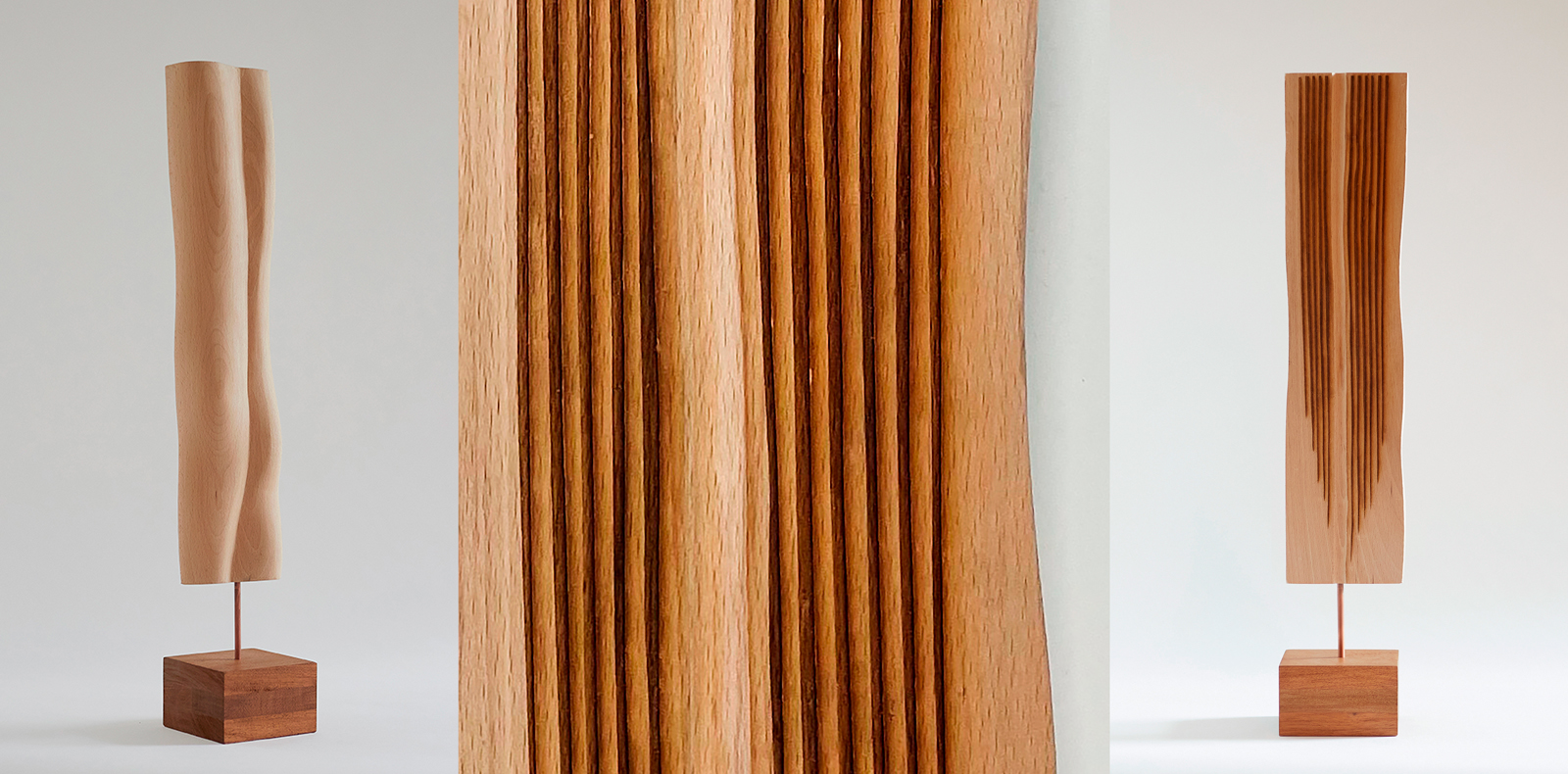 Sculpté à la main et gravé au laser, socle en BER (bois exotique rouge), pièce unique. La série KARSIKKO est inspirée par la tradition ancienne nlandaise des arbres de mémoire, des vieux pins scarifiés pour commémorer une personne ou un événement, en enlevant une partie de l’écorce et en y gravant des initiales et des dates.