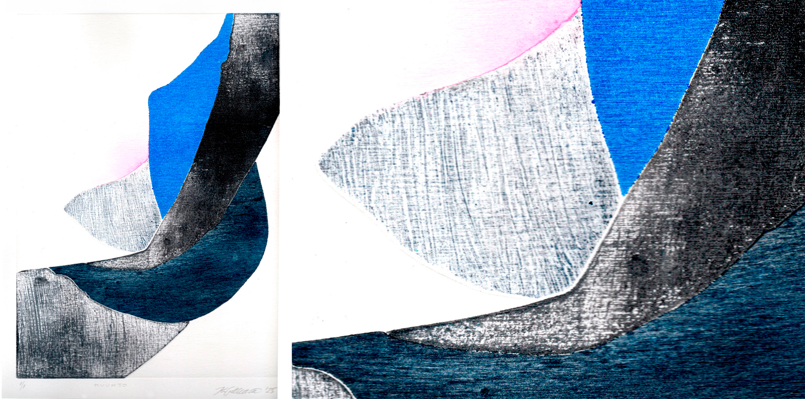 Mixed media woodcut, original woodcut printed with intaglio ink and hand-painted Japanese watercolor Paper Fabriano Rosaspina 285g cotton.