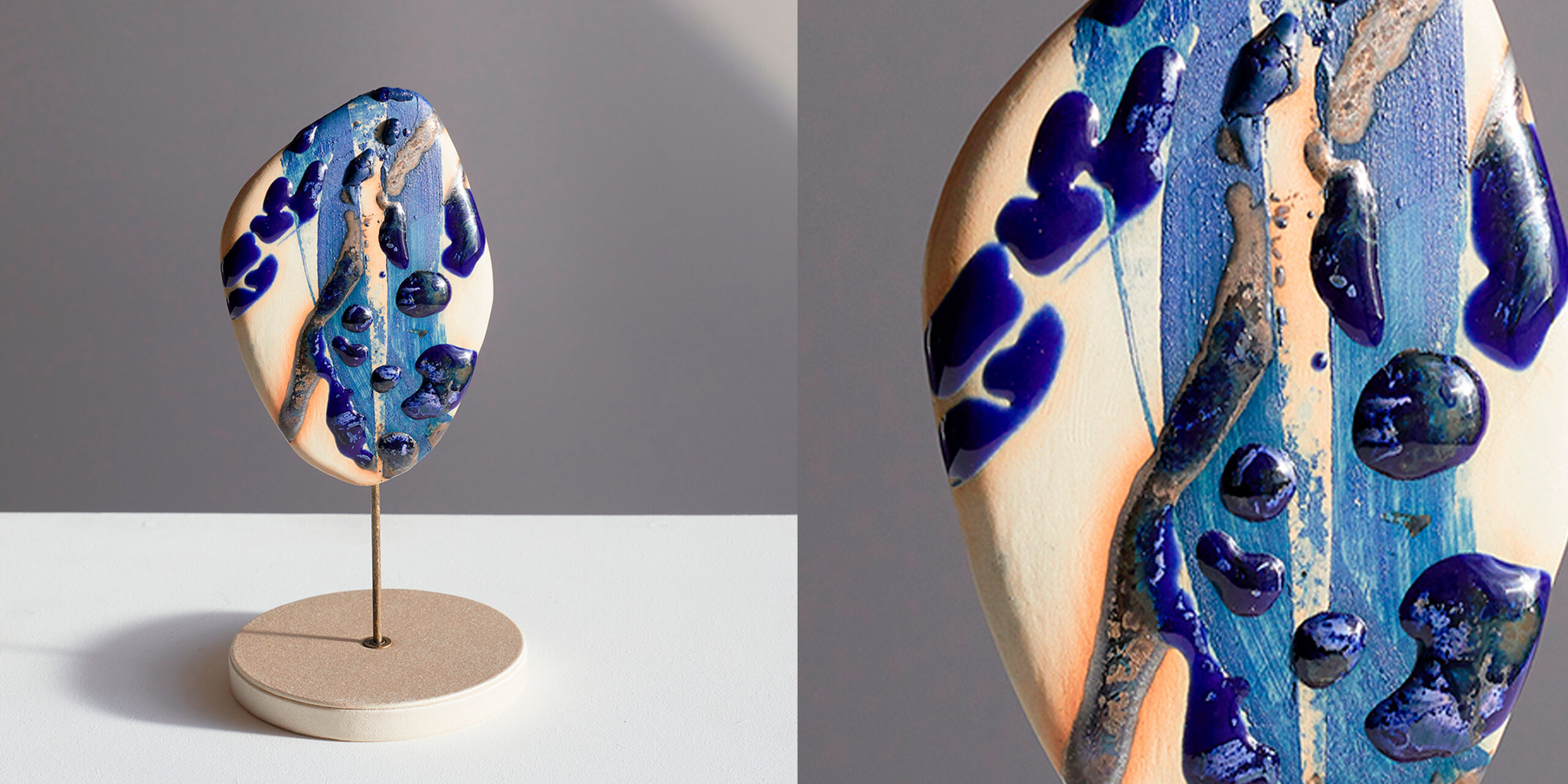 Original white stoneware sculpture, glazed in blue and bronze with ultramarine pigments. The NAAMIO (Mask) series emerges at the threshold between the visible and the hidden. It evokes faces that silently watch from the trees —
