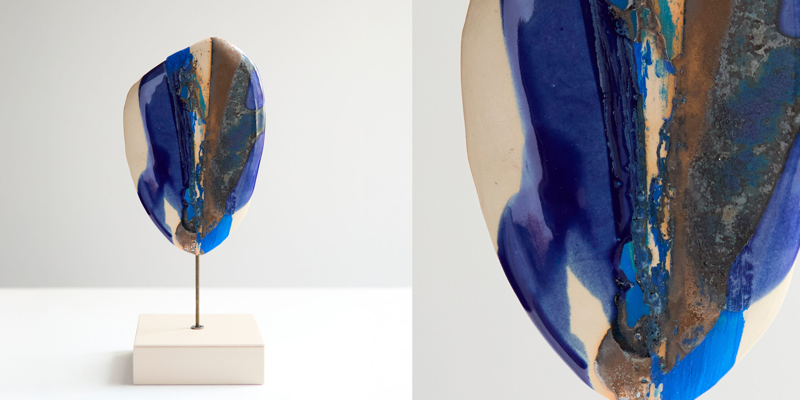 Original white stoneware sculpture, glazed in blue and bronze with ultramarine pigments. The NAAMIO (Mask) series emerges at the threshold between the visible and the hidden. It evokes faces that silently watch from the trees—